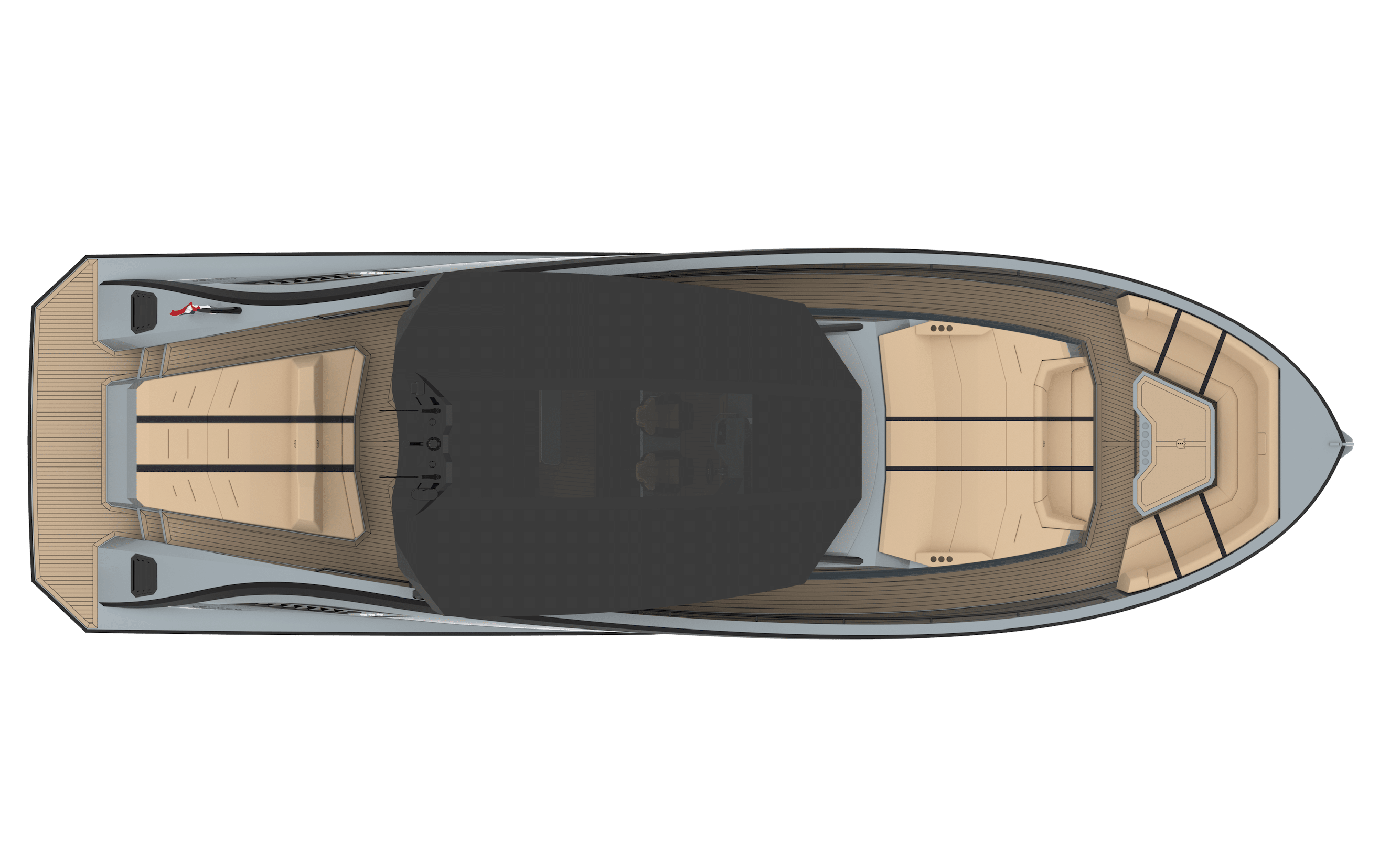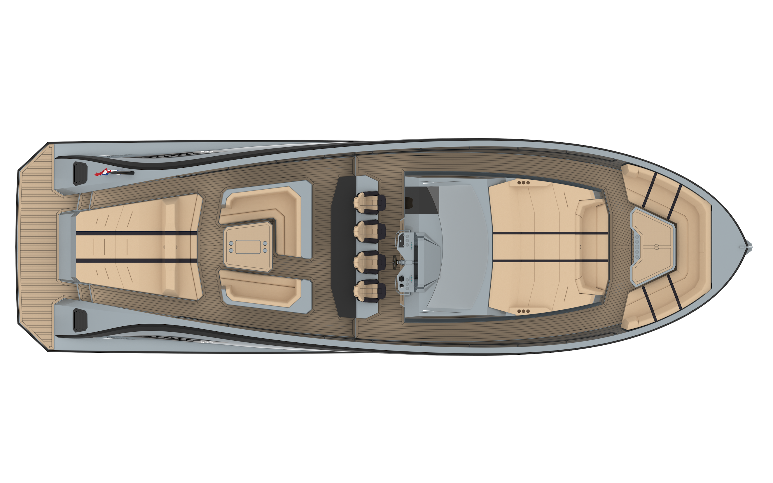 The expansive deck accommodates seating and lounging for up to 30 guests, offering the openness and presence of a 60+ foot yacht. Thanks to her aluminium construction, the exterior layout is fully customizable — from an enlarged outdoor kitchen to a U-shaped lounge tailored to your lifestyle.